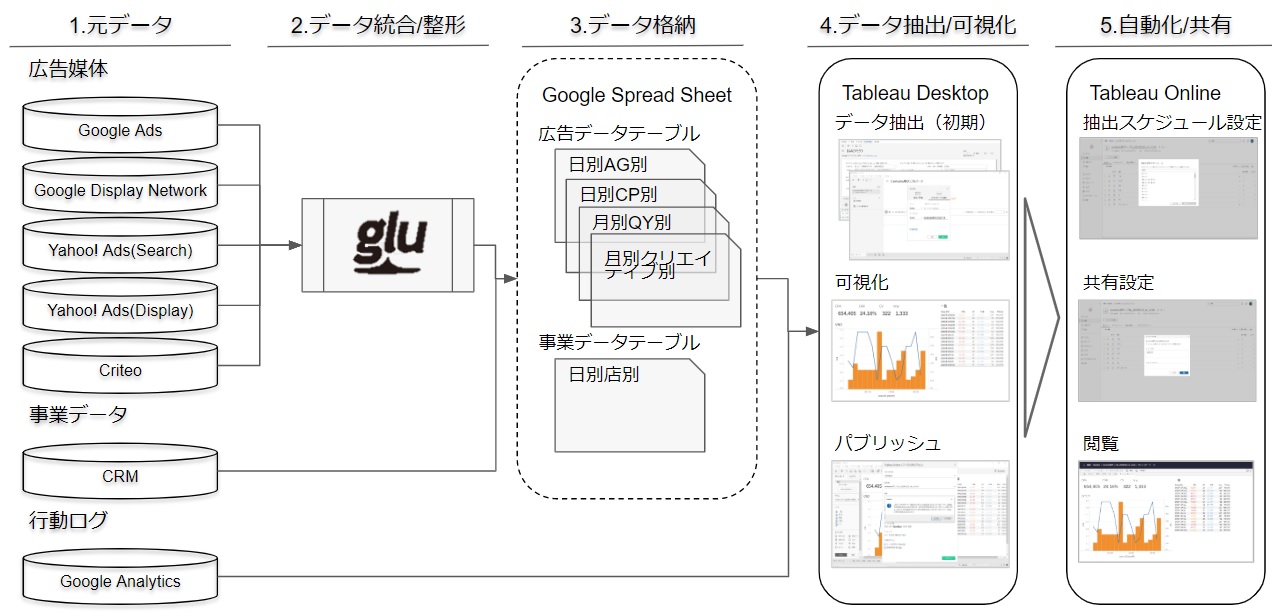 Phase.3ではレポート自動作成支援ツール(運用型広告レポート作成支援システム「glu」を使用します)を通してGoogle 広告・Yahoo!広告・Googleアナリティクス等のデータを収集し、Googleスプレッドシートに自動出力しています。GoogleスプレッドシートからBIに取り込まれ、BIツール上でダッシュボードを柔軟に作成します。(Tableauを使用)